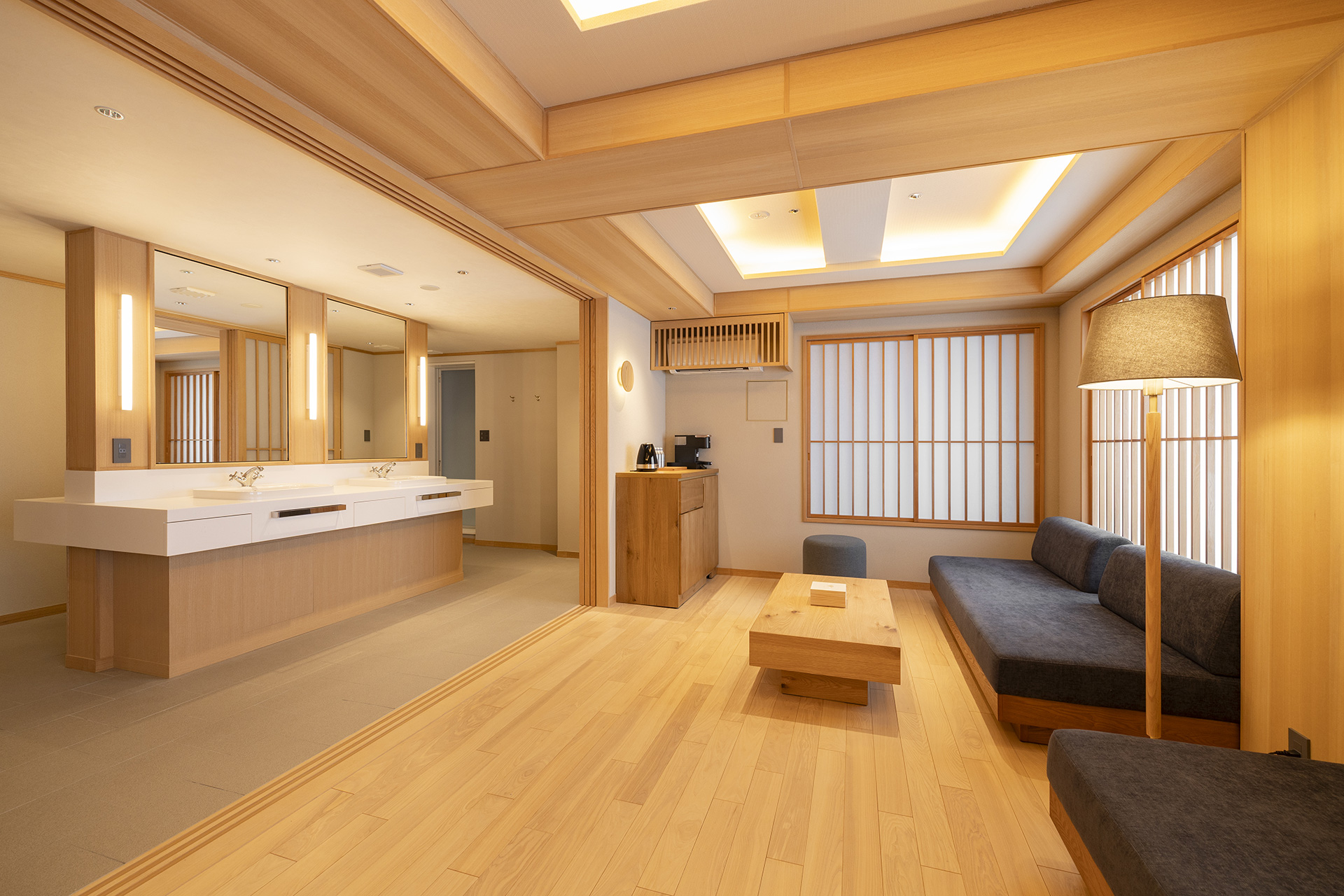 堺町通に漂う季節ごとの香りや老舗の味わいが生む“香りの記憶”をデザインに昇華させたホテル。浴室から枯山水の庭を望める客室や静けさに包まれる大浴場など、感覚の余白を愉しむ滞在が実現。部屋タイプはスタンダードツイン(約48.5㎡/1〜4名)とデラックスツイン(約89.6㎡/1〜6名)の2タイプ。