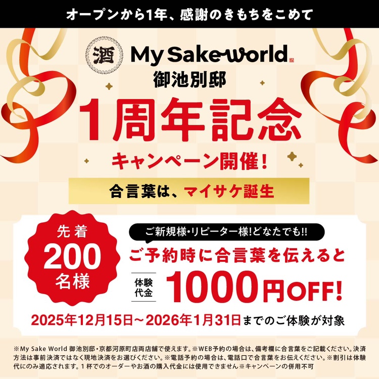 [My Sake World 御池別邸]1周年キャンペーン開催!両店舗で使える先着200名1000円OFF!