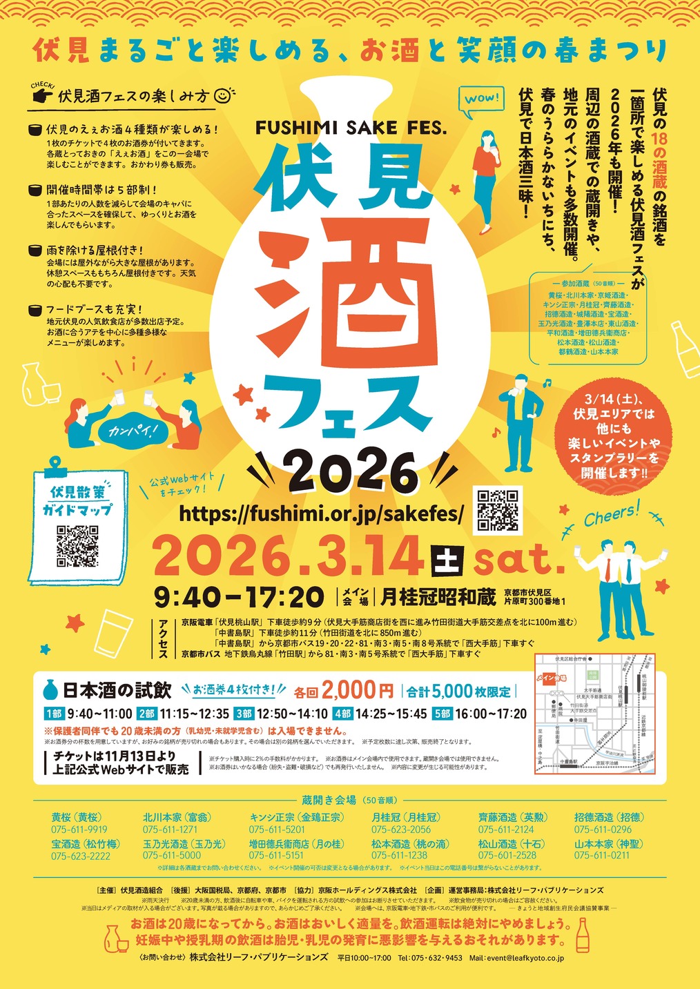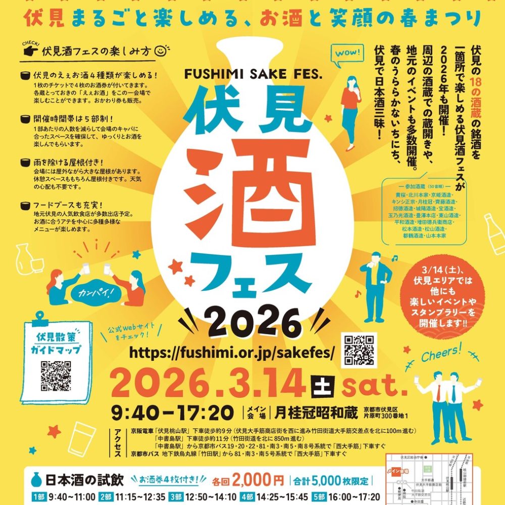 伏見酒造組合では、伏見の清酒の魅力を知ってもらうため「伏見 酒フェス〜FUSHIMI SAKE FES.〜」を2024年に初開催。第三回目となる「伏見 酒フェス〜FUSHIMI SAKE FES.〜2026」を2026年3月14日(土)に開催する。