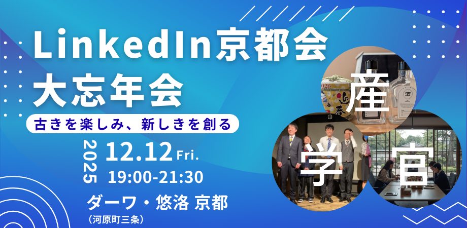 「島津製作所」「毎日放送」「パナソニック」「日立製作所」「SCREEN」と、運営メンバーは京都はもとい日本を代表する企業ないしそのグループに属している。「ビジネスSNSユーザー」という“接続詞”も入ってくるため、ともすれば“お堅い”という印象を受けるも、そこに幅広い世代からのカジュアルさを盛り込んだ場としたのが『Linkedin京都会 大忘年会』となる。