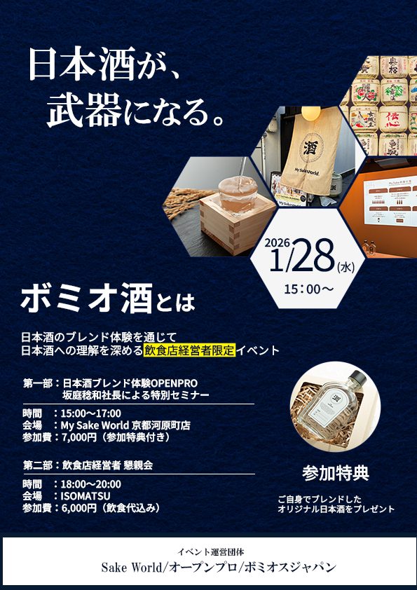 ブレンドによるオリジナル日本酒づくり体験施設としてSake Worldが運営する「My Sake World京都河原町店」にて、飲食店経営者限定イベント[ボミオ酒]を1月28日に開催する。会員制経営者コミュニティを運営する『ボミオスジャパン』と、京都を拠点に関西の飲食店開業支援事業を行う『OPENPRO』との共催で全二部制で開かれる。