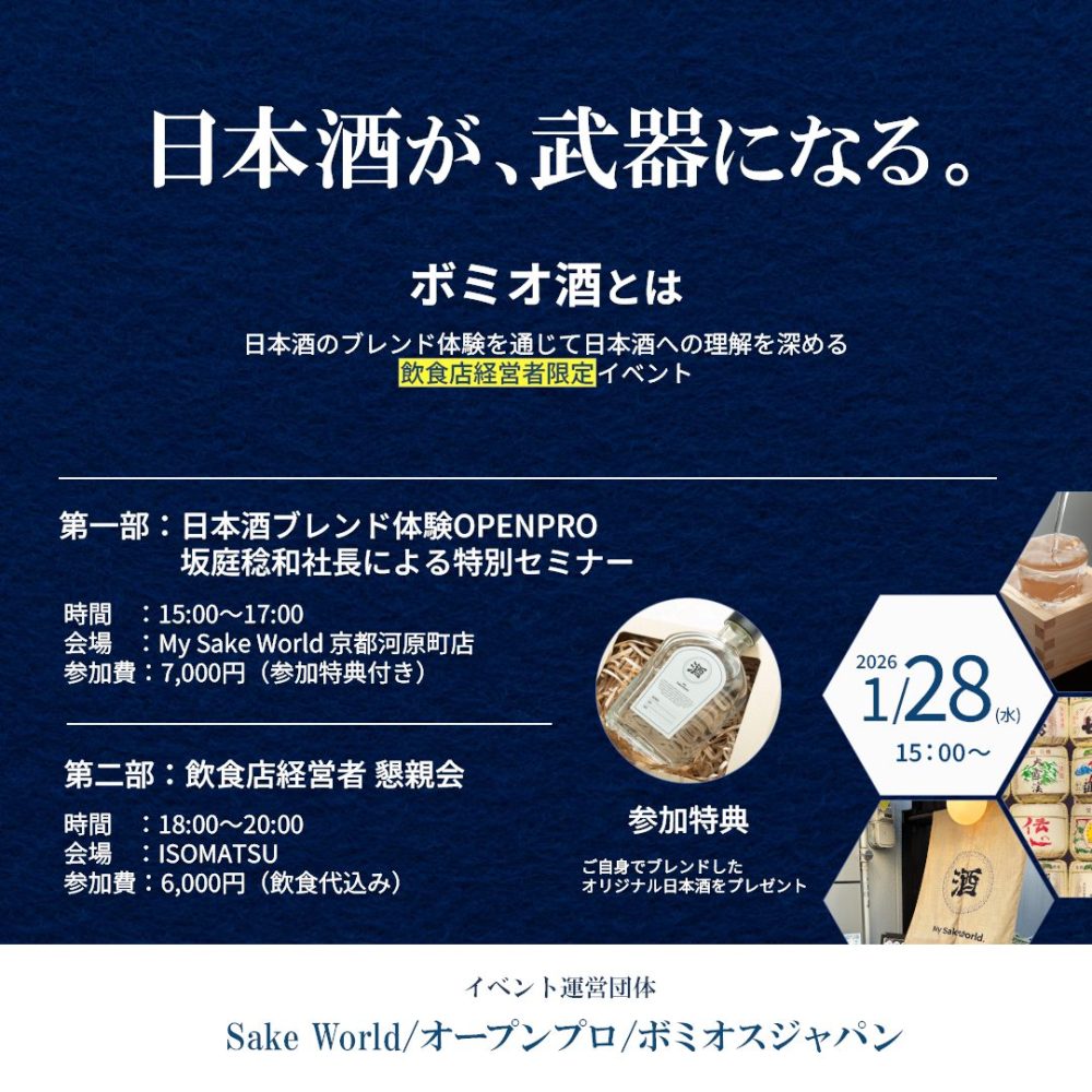 ブレンドによるオリジナル日本酒づくり体験施設としてSake Worldが運営する「My Sake World京都河原町店」にて、飲食店経営者限定イベント[ボミオ酒]を1月28日に開催する。会員制経営者コミュニティを運営する『ボミオスジャパン』と、京都を拠点に関西の飲食店開業支援事業を行う『OPENPRO』との共催で全二部制で開かれる。