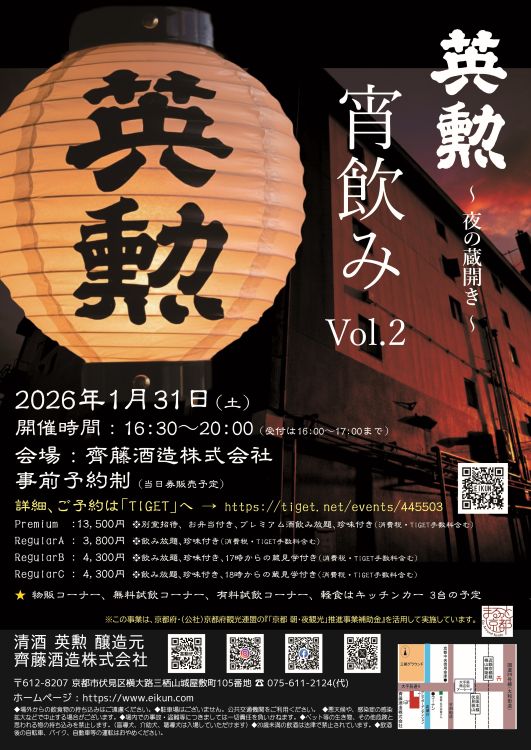 2025年で創業130周年を迎える齊藤酒造が、特別企画「宵飲み」を開催する。2回目となる今回は、蔵見学つきの飲み放題や、プレミアム酒が楽しめる特別プランなど、様々なバリエーションで提供。伏見を代表する酒蔵による夜の蔵開きは、今から注目間違いなし。