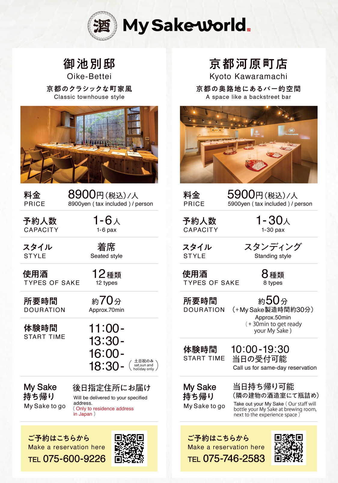オリジナルブレンド日本酒体験施設[My Sake World]は地下鉄烏丸御池駅、京都市役所前駅より徒歩8分「御池別邸」と阪急電鉄京都河原町店より徒歩8分「京都河原町店」の2店舗を展開しています。