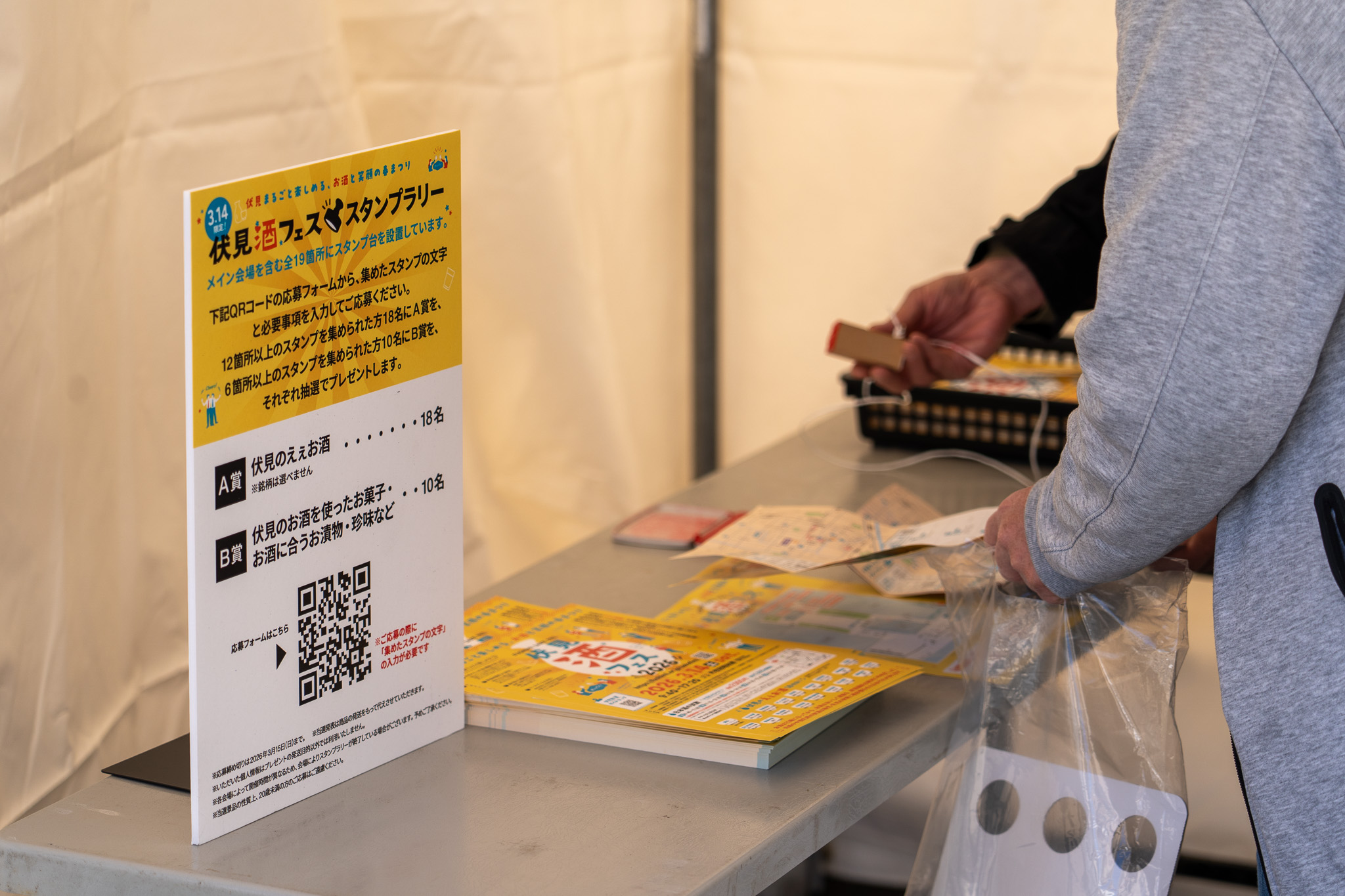 本イベントではメイン会場を含む19箇所にスタンプ台が設置されており、6箇所以上のスタンプで「伏見のお酒を使ったお菓子・お酒に合うお漬物・珍味」、12箇所以上のスタンプで「伏見のえぇお酒」が抽選で当選するキャンペーンが実施された。