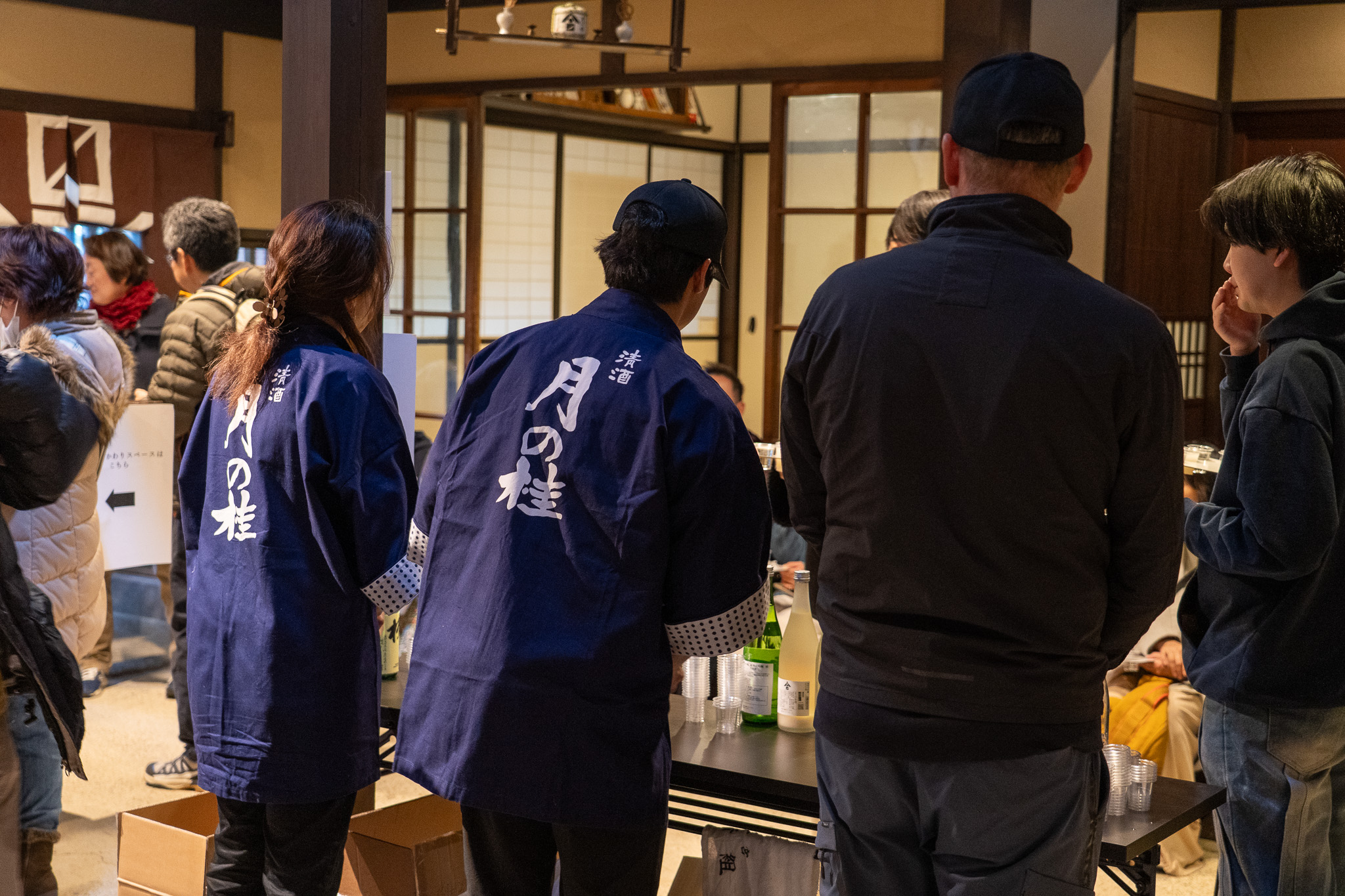 [増田德兵衞商店(月の桂)]では「柳」の生酒と蔵開きの当日に搾った「春がすみ 生酒」、そして「祝 純米大吟醸 にごり生」の試飲セットを提供。