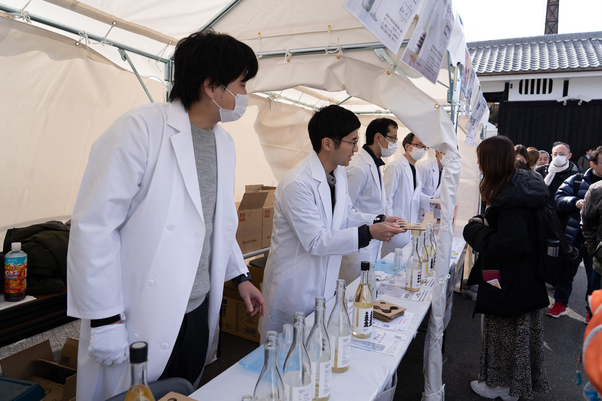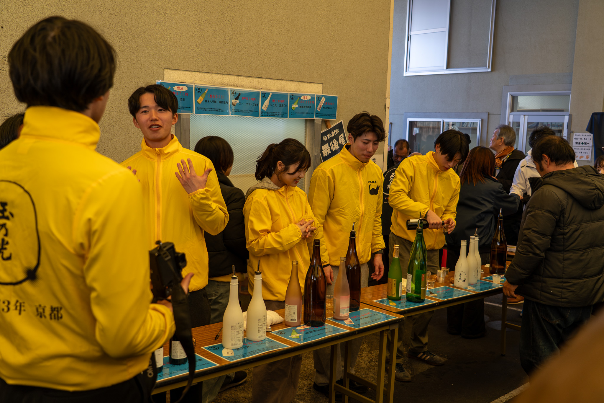 [玉乃光酒造]の試飲ブースは、例年龍谷大学の学生が担当している。世代を超えて伏見の日本酒が親しまれていることを実感させる光景が広がっていた。