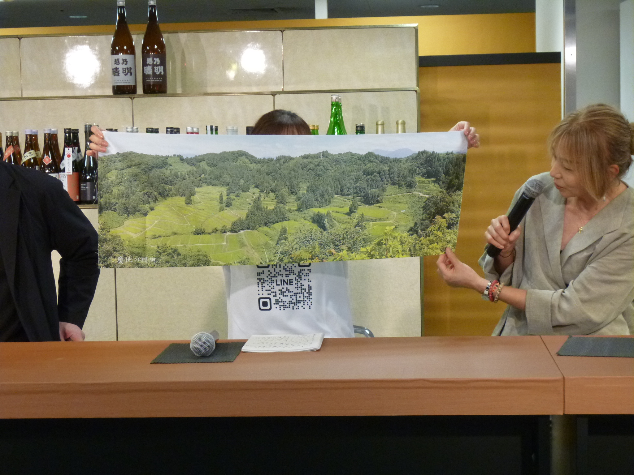 さらに、精米機を持ち込んで、ブースにて精米したての魚沼産コシヒカリ「雪輪」を提供したグローアート水落幸恵さん。夫の和也さんが時折フォローしながら、山口さんに棚田が描かれたてぬぐいをプレゼントする一幕も。