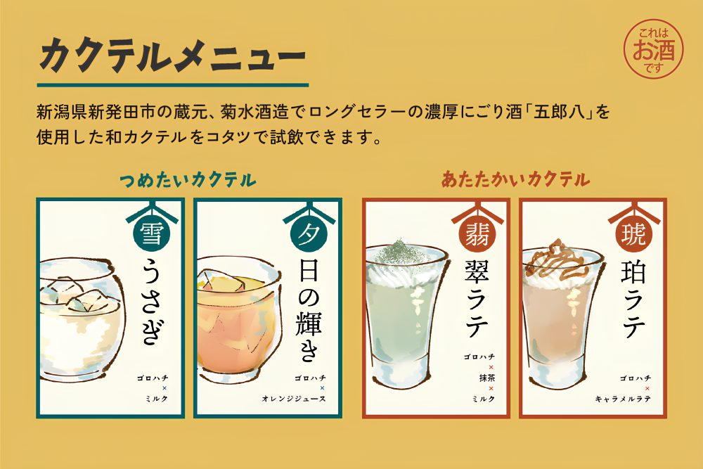 酒好きにとっては注目必至な企画の正体は、新潟県新発田市が誇る銘酒・菊水酒造が仕掛けたイベント「ゴロゴロ、ごろはち~こたつ酒場~」。秋冬限定のにごり酒「五郎八(ごろはち)」を、こたつに入ってぬくぬく、さらにお洒落なカクテルスタイルで楽しむという。
