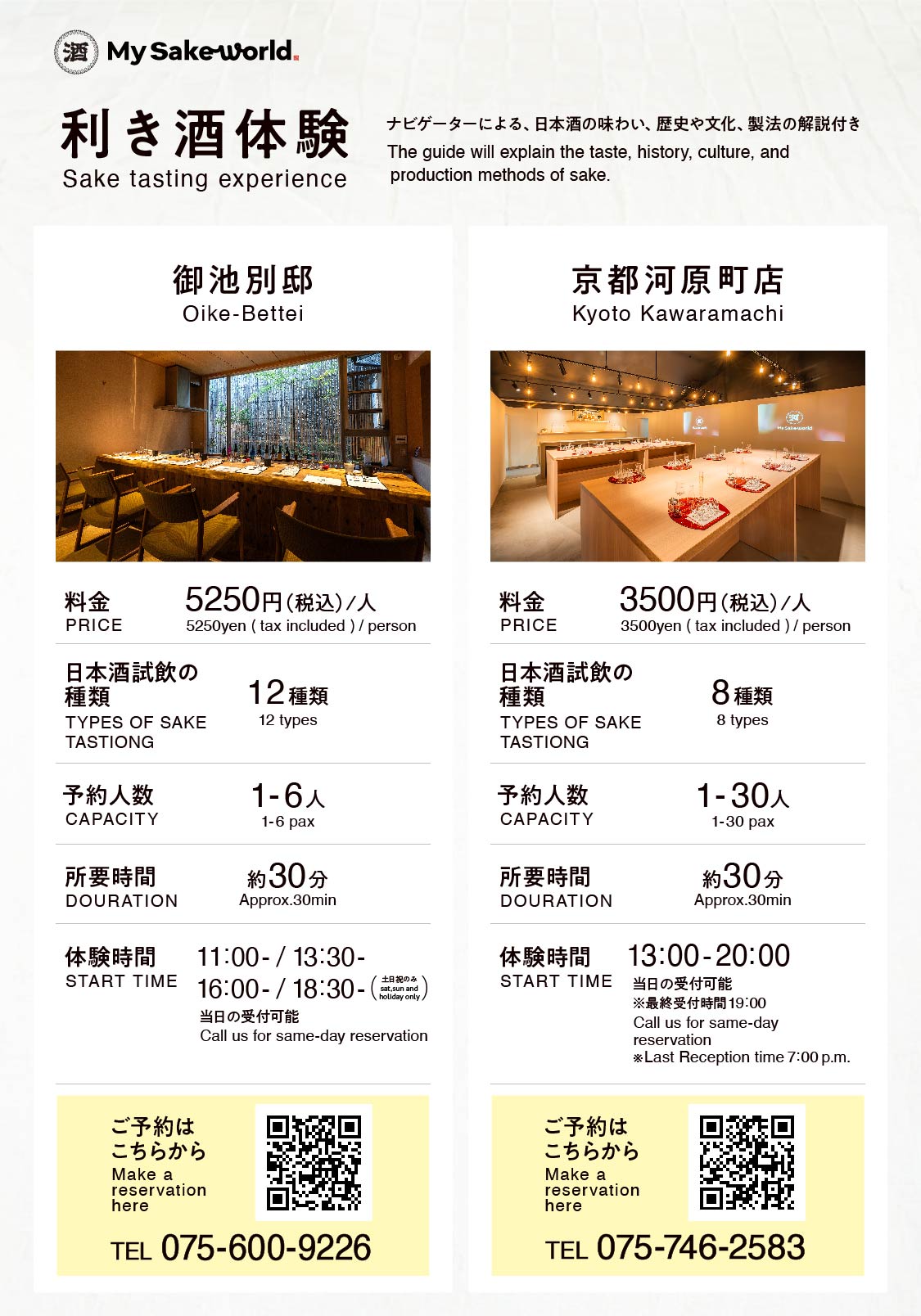 京都烏丸御池と京都河原町に2店舗。ナビゲーターによる、味わい、歴史や文化、製法の説明を聞きがながら利き酒体験が新たにスタート。